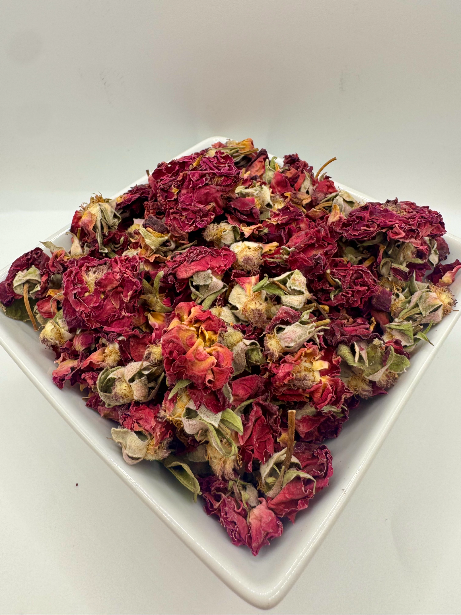 Whole dried rose buds with loose petals. They are a naturally aromatic, floral treat designed to add beauty, variety, and enrichment to your small pet's daily routine.